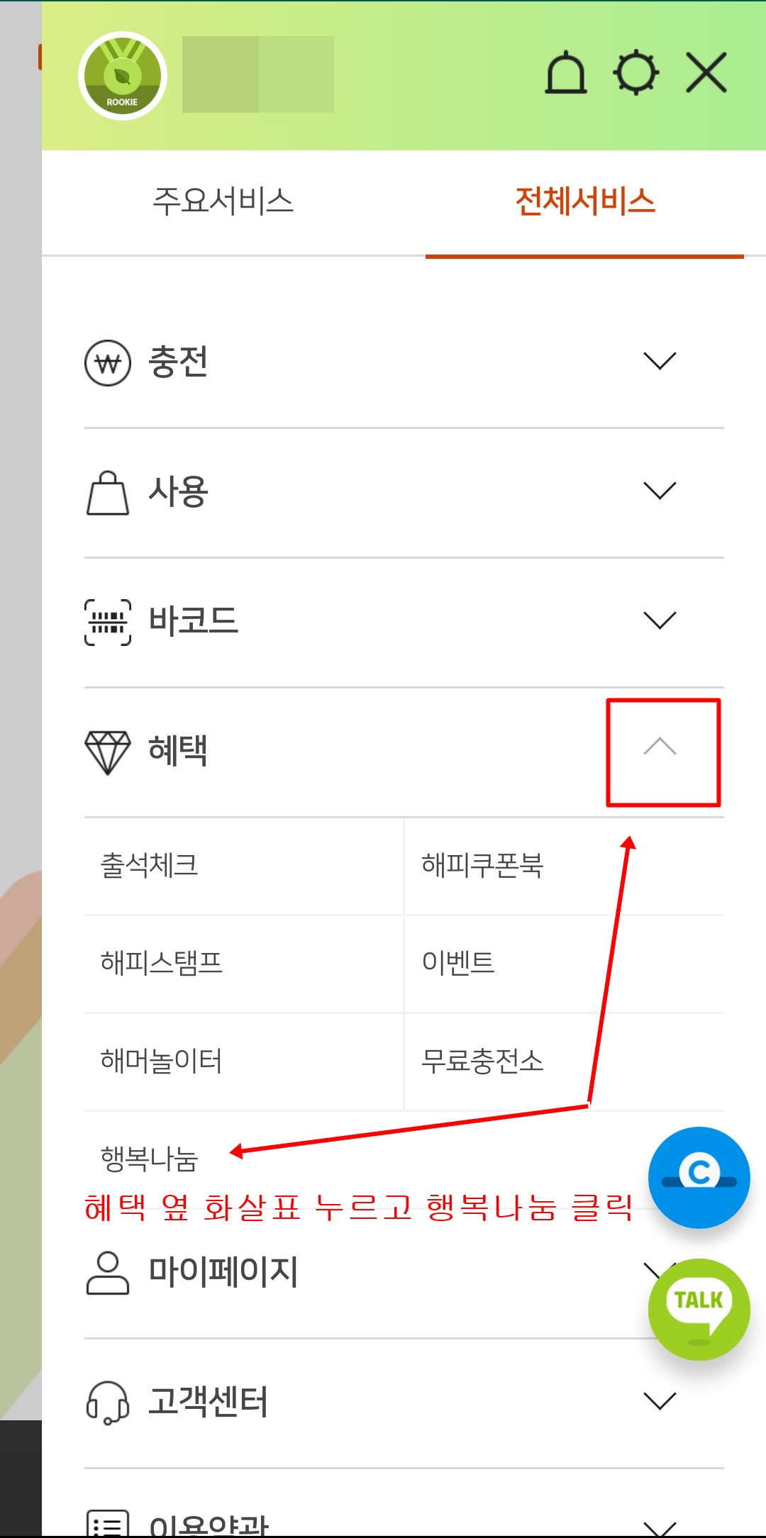 그다음 밑에 혜택이라는 메뉴가 있는데요. 혜택 옆에 화살표 모양을 눌러 주시면 아래와 같이 추가 메뉴들이 뜹니다. 이중에서 행복나눔을 눌러 주세요.