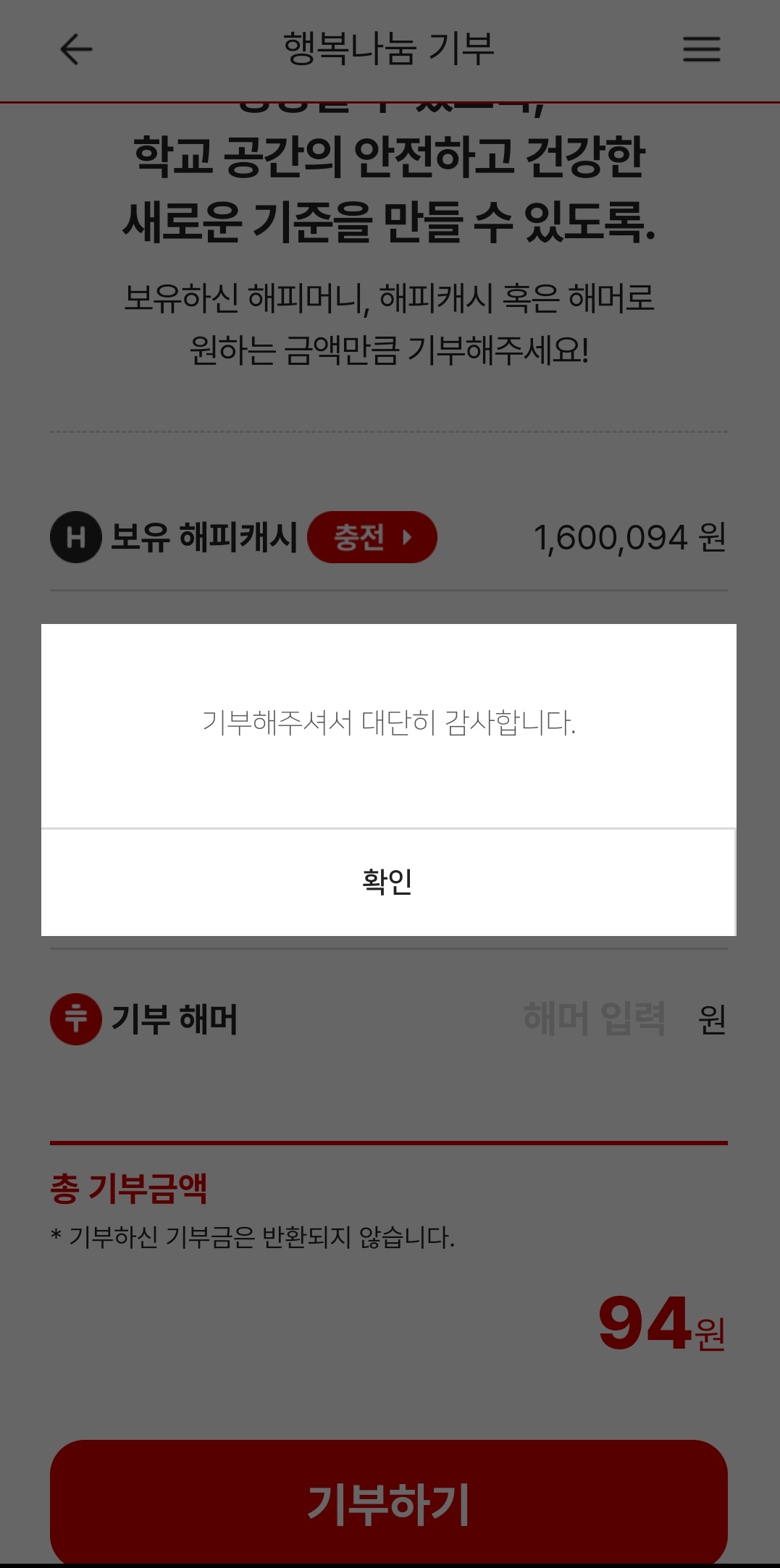 이제 기부가 끝났습니다. 확인을 누르시면 메인화면으로 돌아 왔을 때 깔끔하게 금액이 떨어 지게 됩니다.