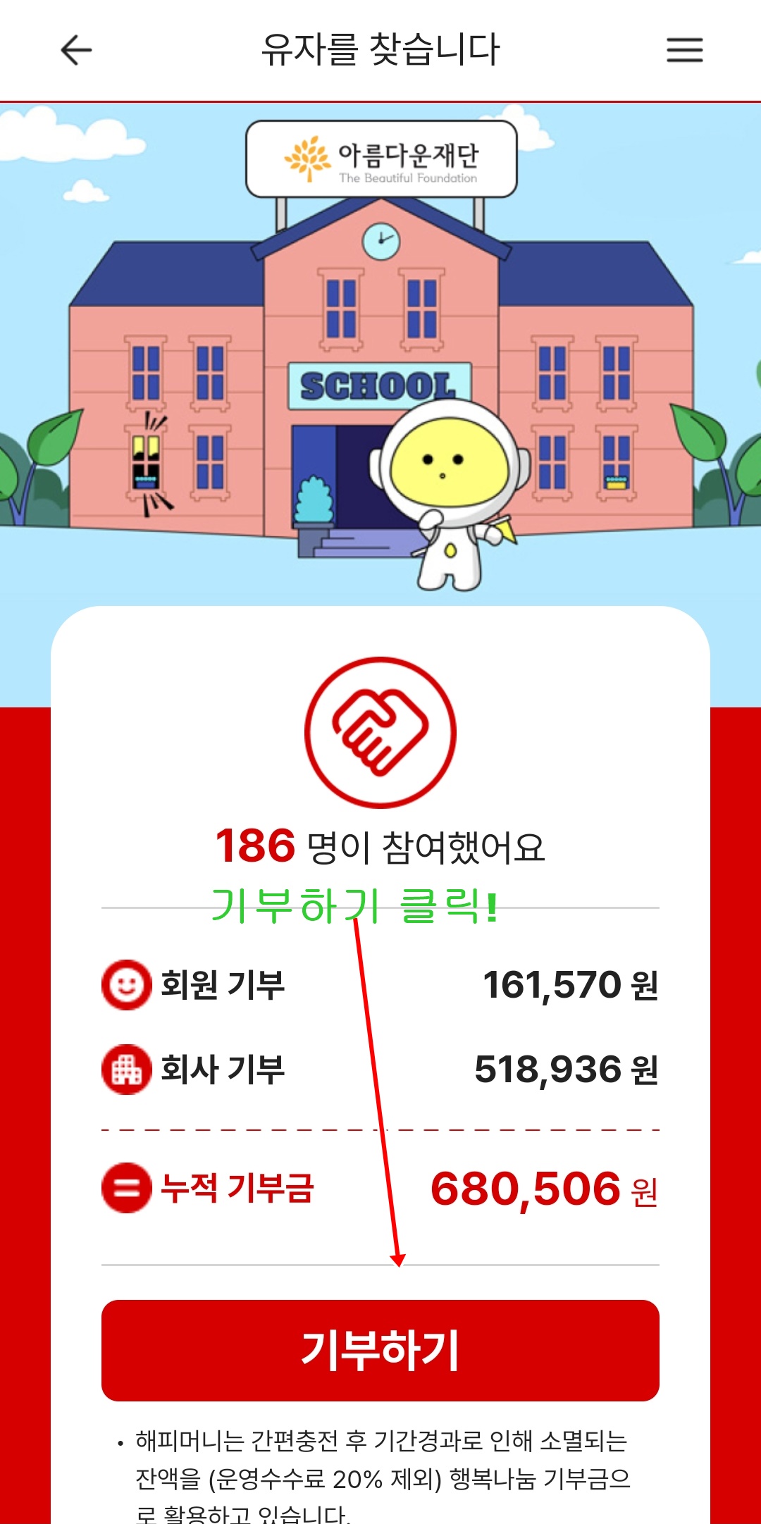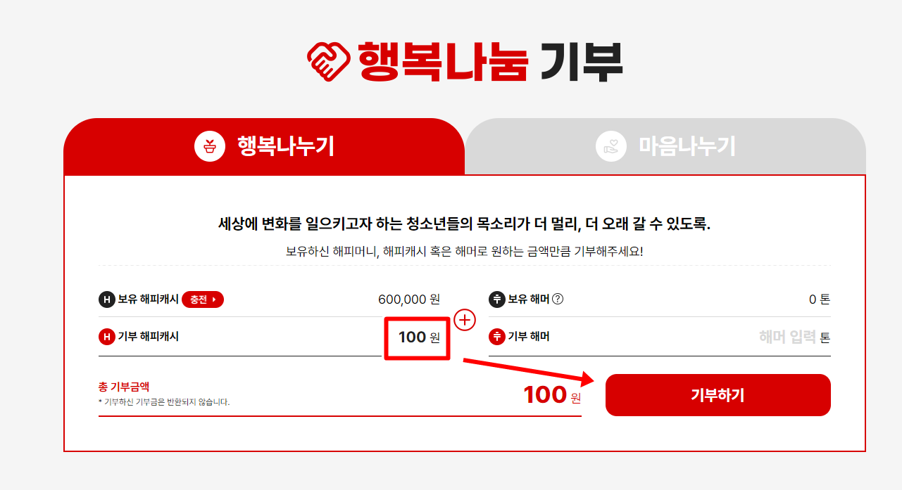 기부할 해피캐시를 입력 하신 후 기부하기를 눌러 주시면 기부가 완료 됩니다.