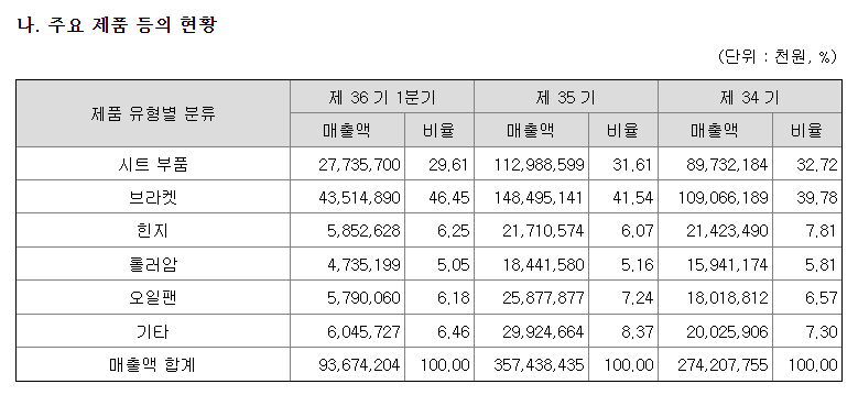 대부분의 매출은 브라켓과 시트 부품군에서 발생되고 있습니다. 내수와 수출용의 점유율 또한 양호 합니다. 브라켓의 경우 차량의 구동계에 들어가는 부품 입니다.