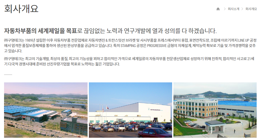 구영테크는 자동차 부품회사로써 약 천여종 이상의 자동차 부품을 생산하여 현대기아차에 납품하고 있습니다. 최근에는 사업 다각화를 위해 미국 현지 법인과 중국 법인에서 다양한 판매처를 증대하고 있습니다.