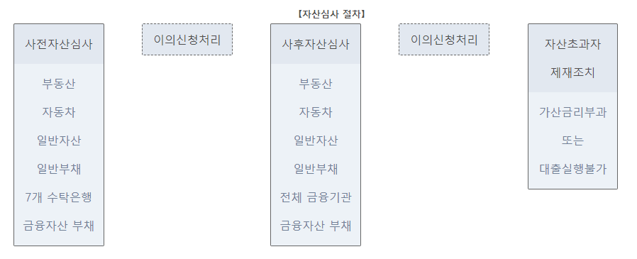 사전자산심사를 먼저 진행한 후 사회보장정보원을 통해 수집되는 금융기관의 전체 금융자산 및 부채내역을 수집한 뒤 사후자산심사를 진행 합니다.