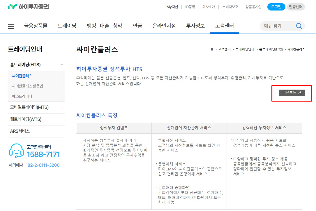하이증권 홈페이지에 가시면 상단에 메뉴가 많이 있는데요. 가장 우측에 있는 고객센터를 누르신 후 트레이딩 안내에서 홈트레이딩에 들어가신 후 싸이칸플러스를 눌러 주세요.