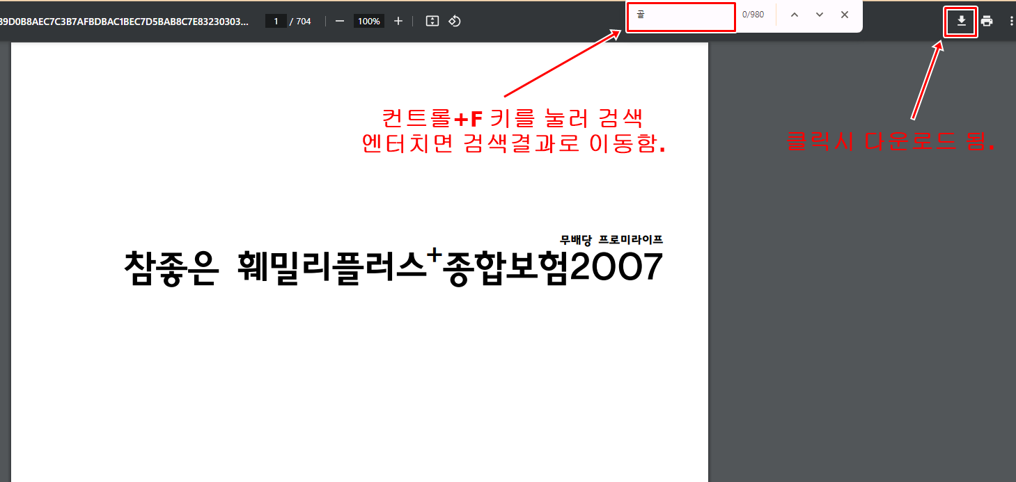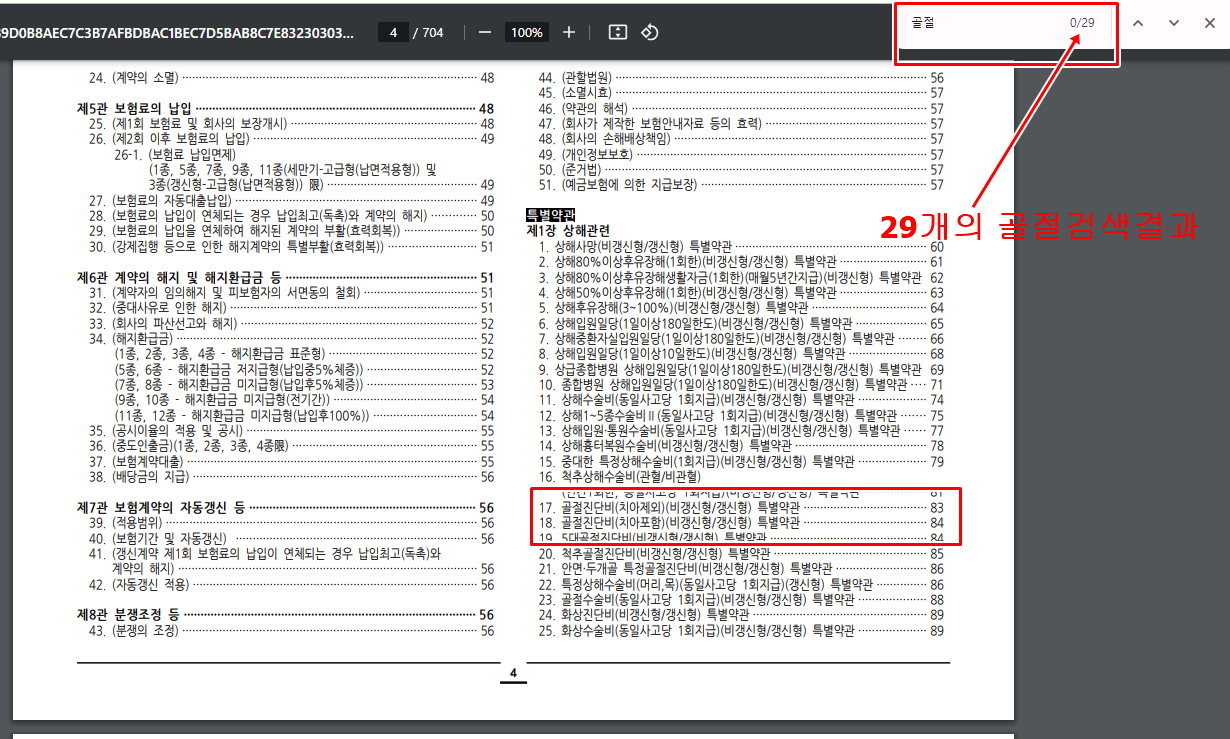 예를 들어 골절에 대해 궁금하다면 약관을 켜시고 컨트롤+F 키를 동시에 누른 후 검색창에 골절 이라고 치시면 골절에 관한 내용을 찾아 볼 수 있습니다.