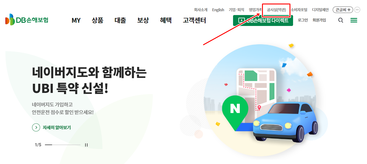 DB손해보험 약관 다운로드 하는 방법에 대해 알려 드립니다. 먼저 DB손해보험 홈페이지로 이동 해 주세요. DB손보 메인화면에 보면 상단에 공시실(약관) 이라는게 보이실 겁니다. 공시실(약관)을 클릭 해 주세요.