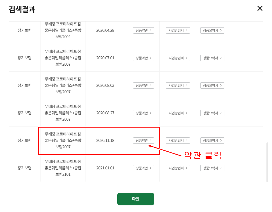 같은 이름의 상품이 여러개인 경우 내 보험 가입일을 기준으로 선택하시면 됩니다. 예를들어 내 보험 가입일이 20년도 11월 30일이라고 하면 아래 그림의 약관을 다운 받으면 됩니다.